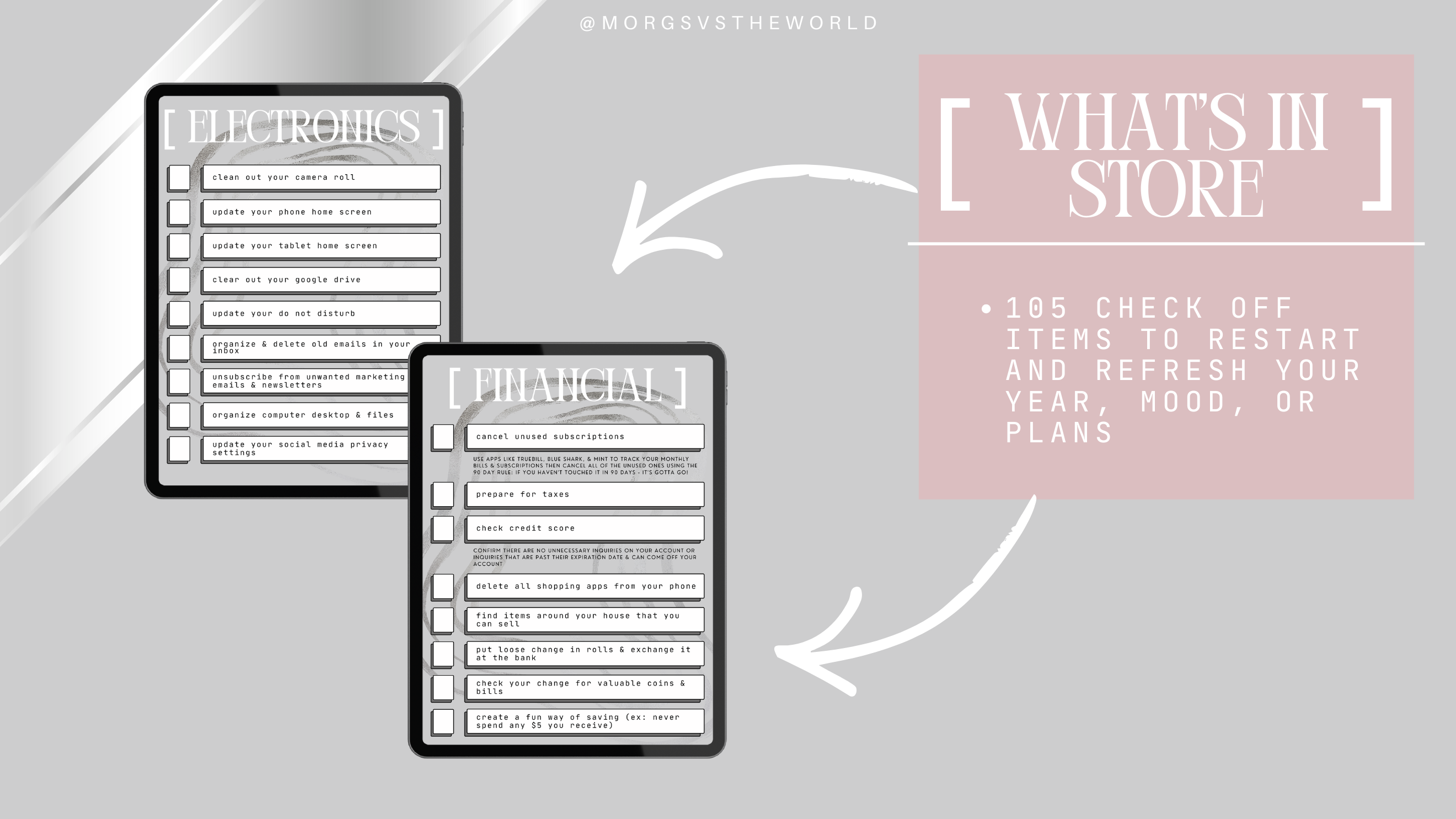 The 2026 Reset Checklist is your go to tool for clearing out the old and stepping into the new with clarity. This thoughtfully curated checklist includes 105 common & overlooked tasks designed to refresh your life, space, and routines. From financial and digital cleanups to home and personal resets, it helps you stay organized, intentional, and aligned as you prepare for your best year ahead.